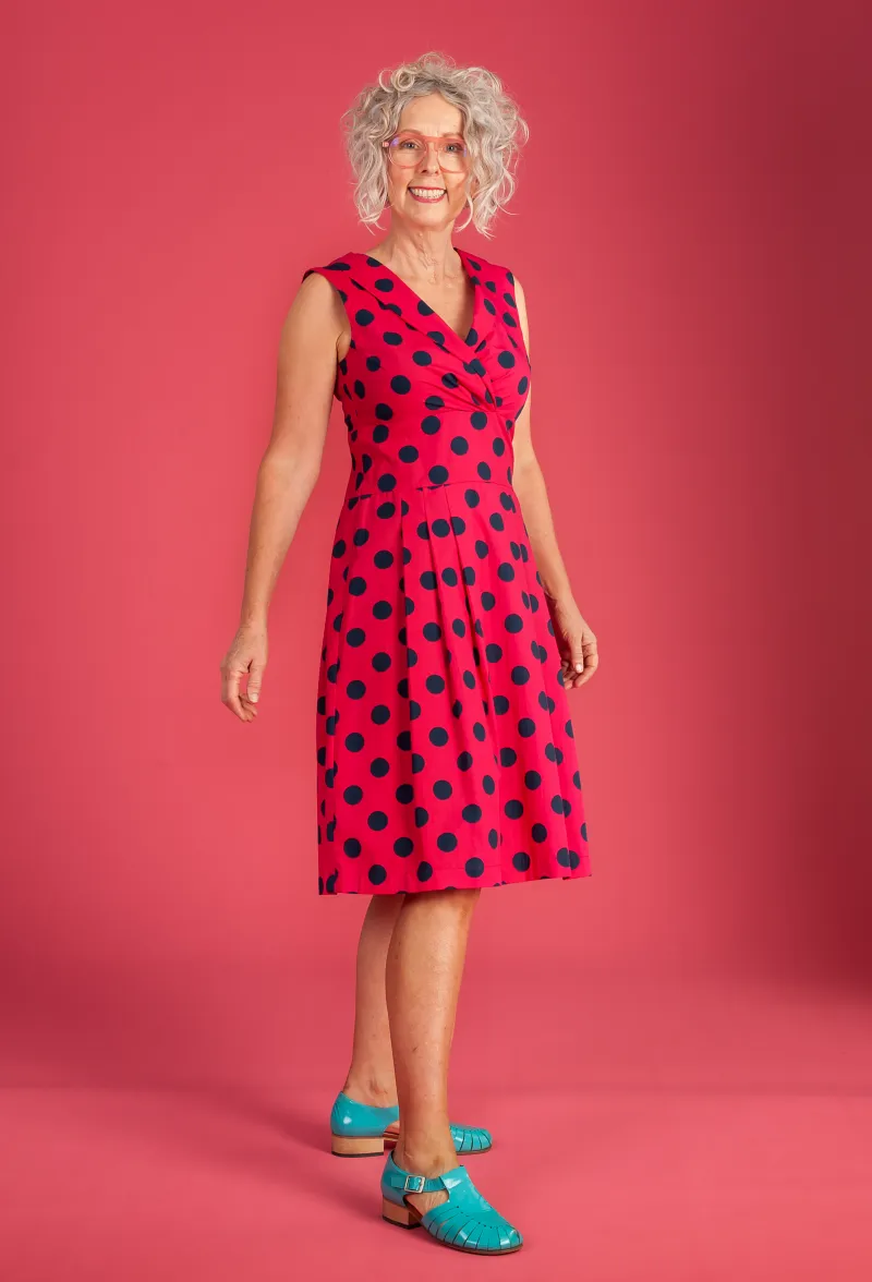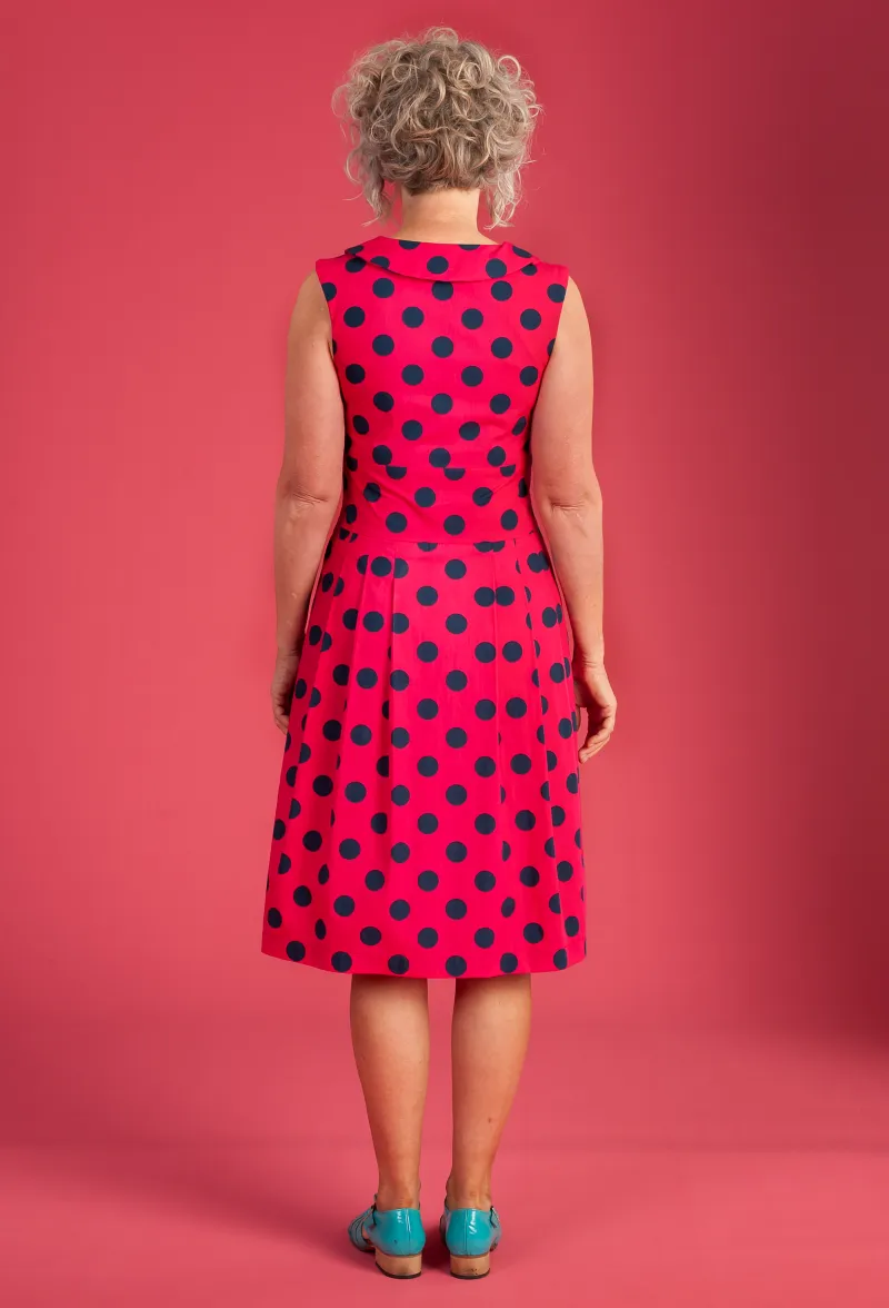 Be noticed in this bold, magenta pink dress with navy blue polka dots all over! Made in a super flattering style and in 100% cotton this will be perfect for those long summer nights.