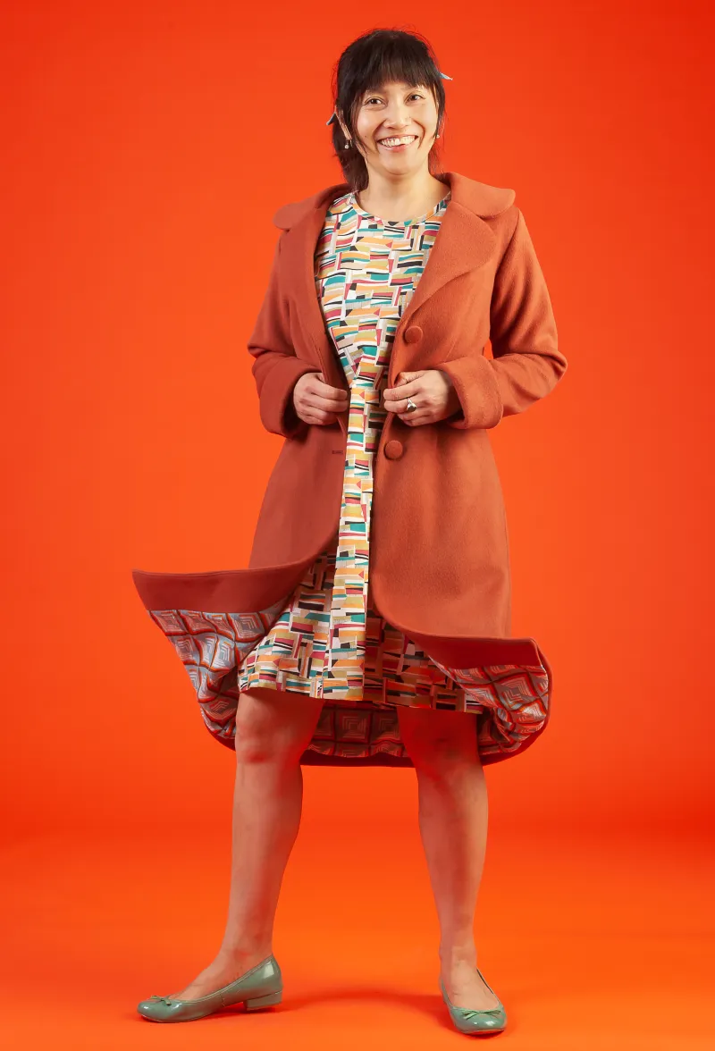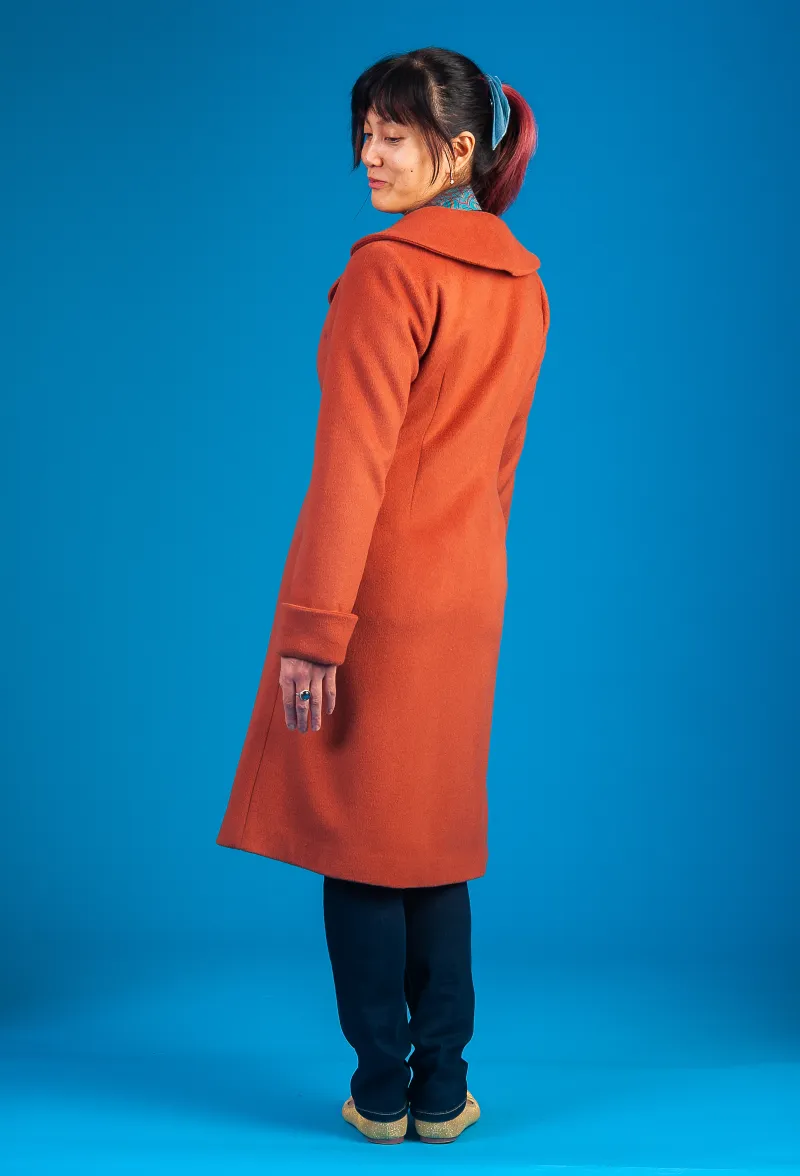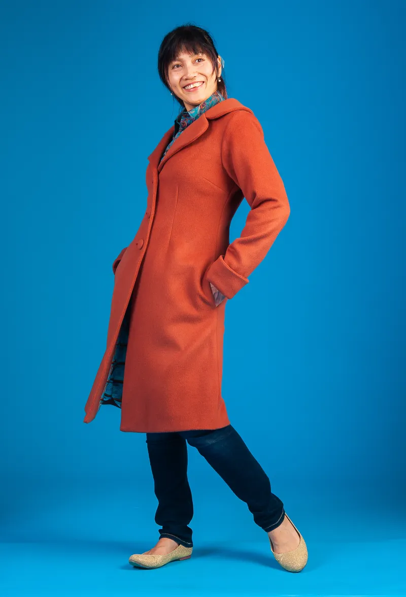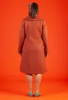 This stunning longer length coat is in a warm cinnamon coloured wool with a soft velvet like finish, you will be warm from top to toe. Practical with generous side pockets for your phone & keys or just to keep your hands toasty and warm.