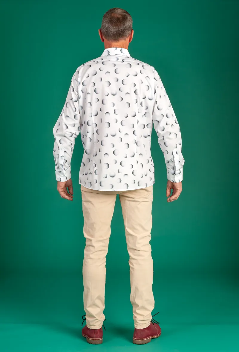 Golf balls rocket around this crisp white cotton shirt for a par-fect bold print. Wear on a night out, to the office, or even better - during a game of golf.