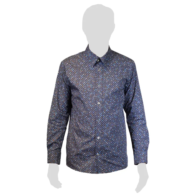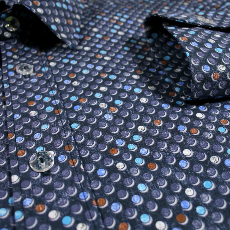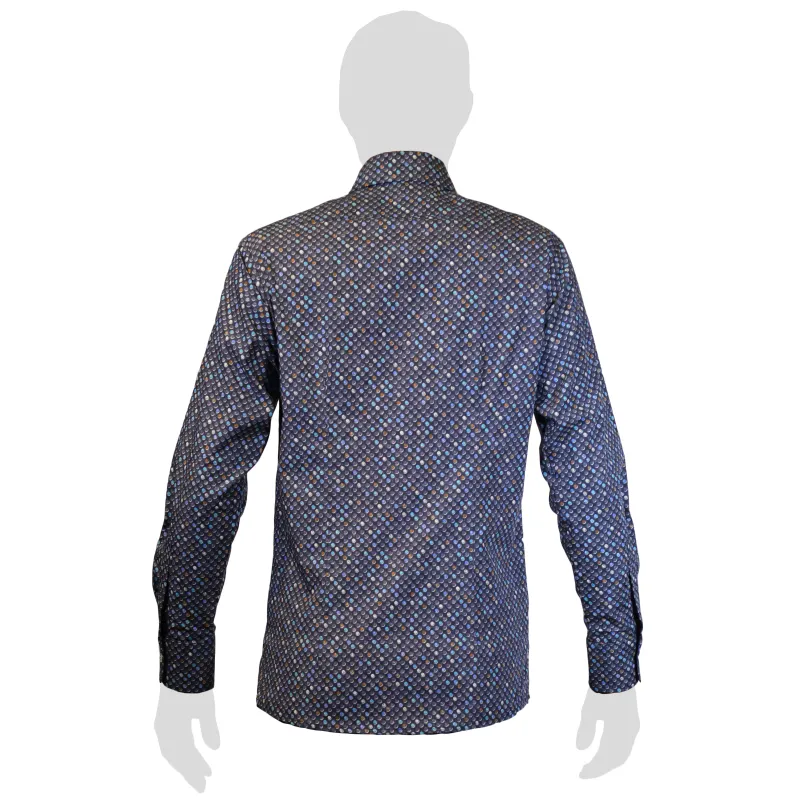 Multi-toned dotty fabric with funky holographic buttons that shine like Paua shell against the hues of the shirt