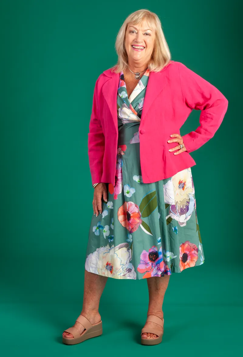 Tailored hip length jacket with a lovely waist fit in a bright fuchsia. This little number will brighten up any outfit. Wear with a dress or smarten up a pair of pants or jeans.