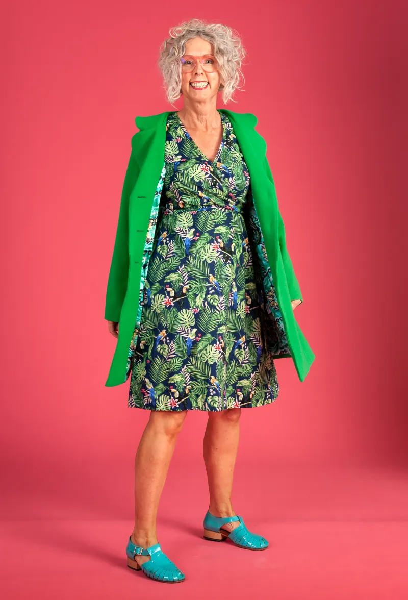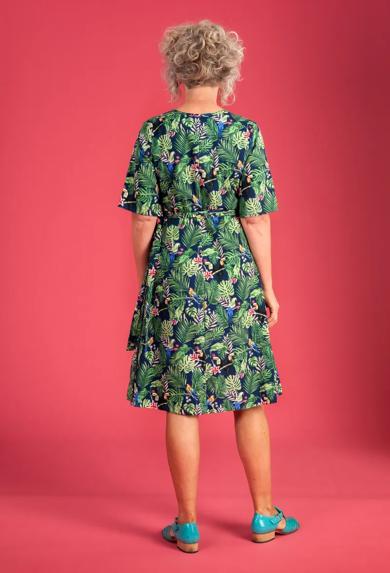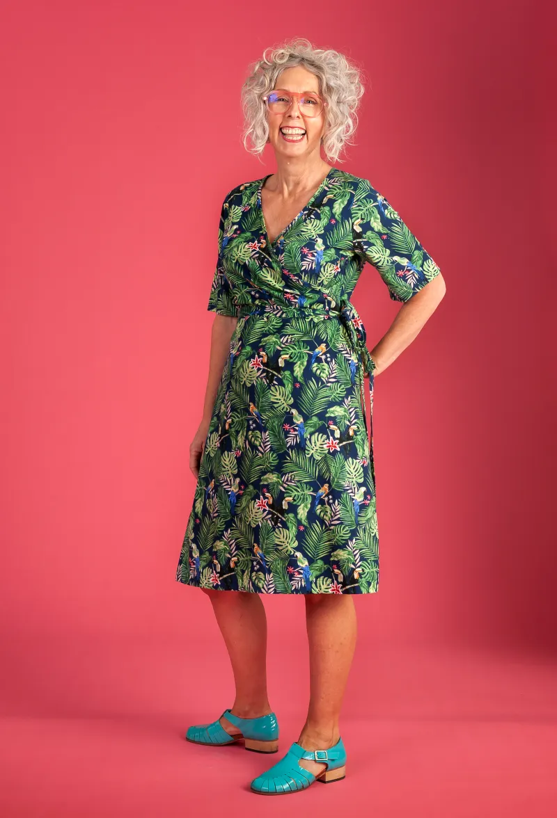 A beautifully easy wrap style in soft 100% cotton adorned with parrots of the tropics, palm and monstera leaves with a navy blue background. You’ll feel like you’ve just stepped into ‘parrot-dise’ while wearing this dress!